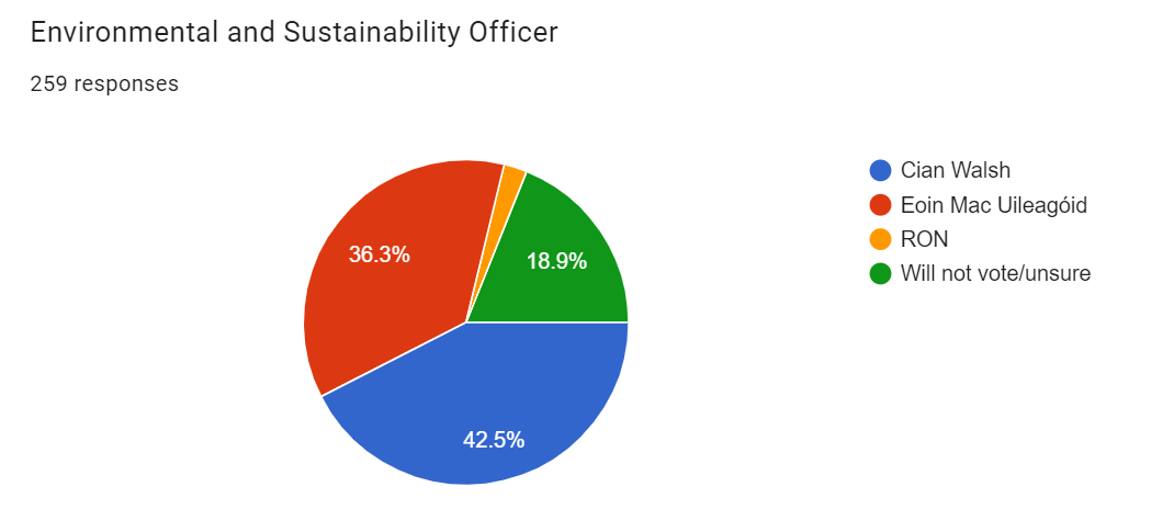 There isn’t much to say about Ionadaí Gaeilge agus Cultúir - with almost 79 per cent of the poll, Finn has a 99 per cent chance of winning. She has the lowest RON opposition of any uncontested candidate, but given we received comments in the poll that the SU should ‘kill’ the ‘obsession’ with Gaeilge, we recommend she relax now, and save her energy for tackling that debate in the new year!
